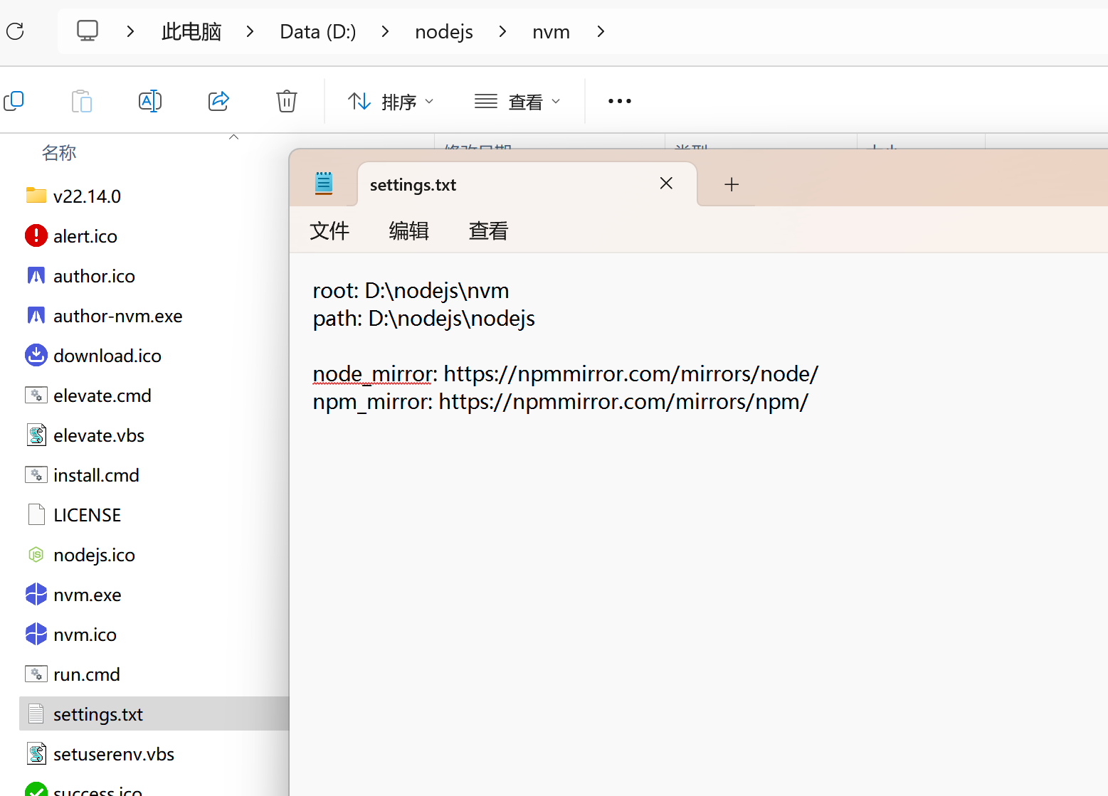 在 nvm 的安装路径下,找到 settings.txt,在后面加上这两行,设置国内淘宝镜像源: